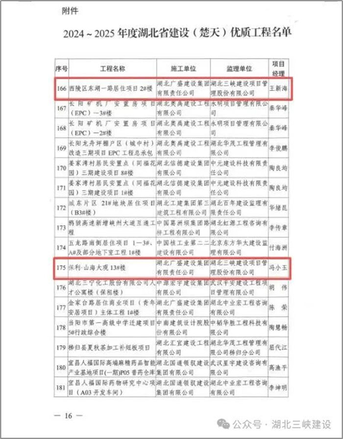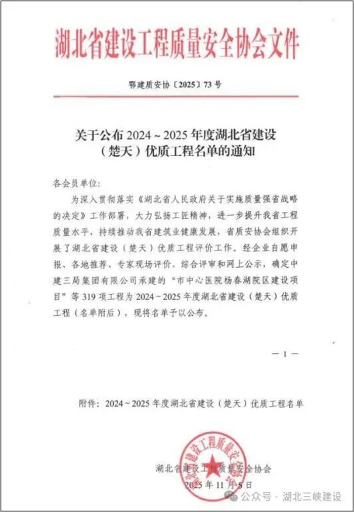 热烈祝贺我公司在2024-2025年度湖北省建设(楚天)优质工程名单中,开云·体育-开云(中国) (含原宜昌平湖工程建设监理有限责任公司)等5个项目荣获我省“楚天杯”!