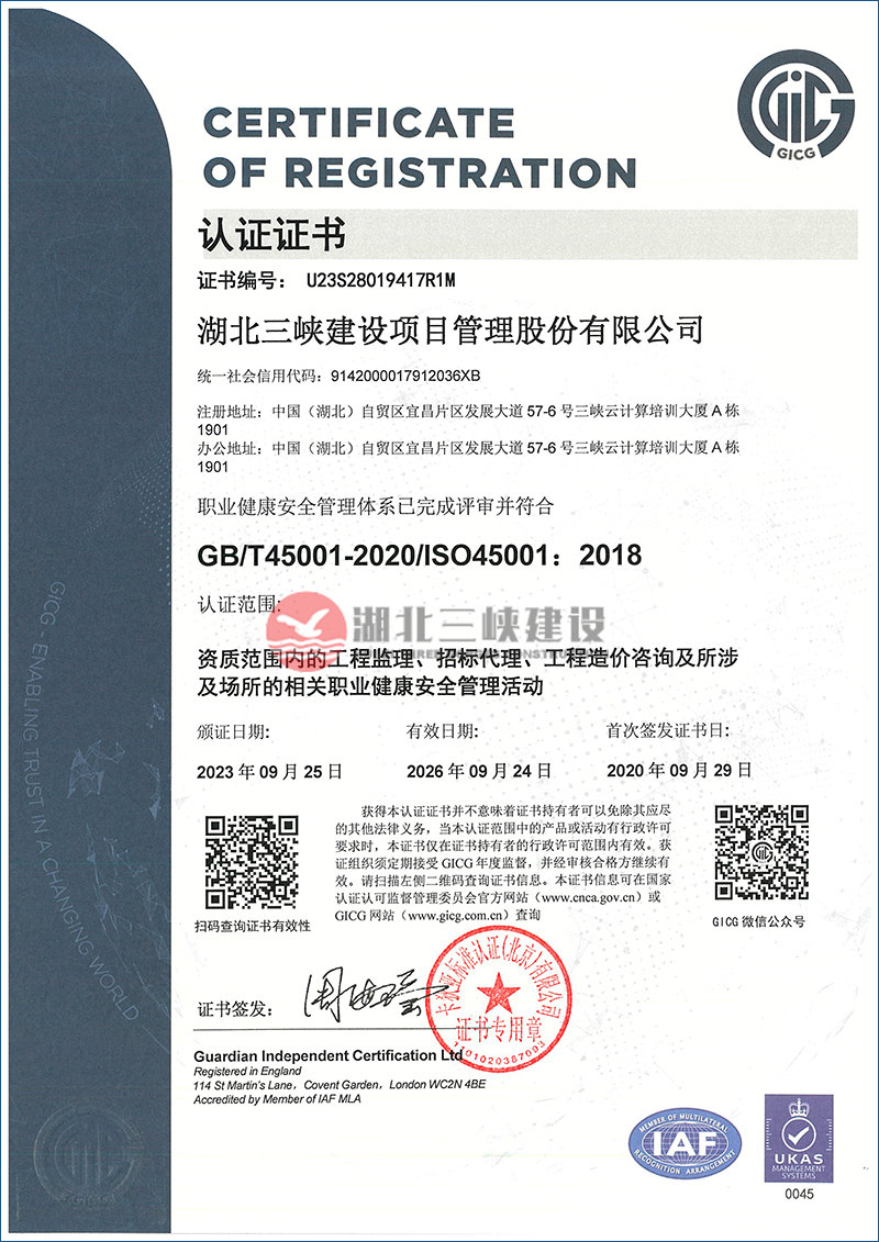 职业健康安全管理体系证书