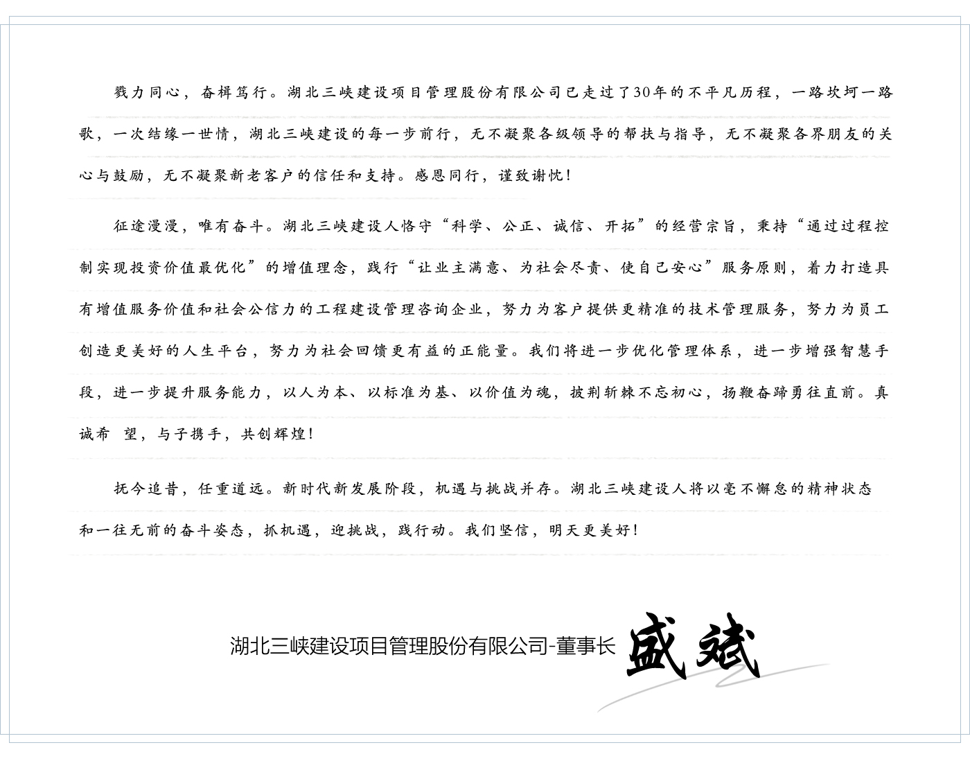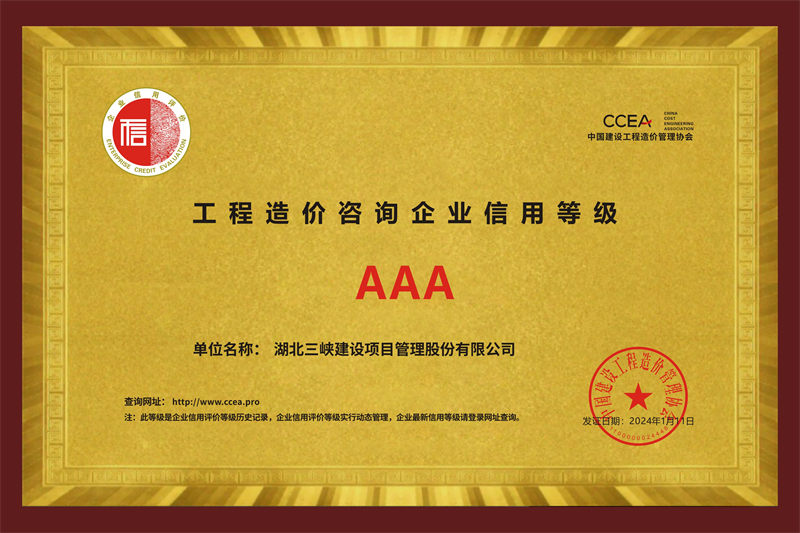 近四十年以来,三峡建设人恪守“科学、公正、诚信、开拓”的经营宗旨,秉持“通过过程控制实现投资价值最优化”的增值理念,践行“让业主满意、为社会尽责、使自己安心”服务原则,着力“打造具有增值服务价值和社会公信力的工程建设管理咨询企业“,努力为客户提供更精准的技术管理服务,努力为员工创造更美好的人生平台,努力为社会回馈更有益的正能量,广泛得到项目业主和建设行政管理部门的高度信任和支持。公司连续连续十六年获湖北省先进监理企业、连续十七年获湖北省守合同重信用企业,被中国建设工程造价管理协会信用评价为“AAA”等级,被中共宜昌市西陵区委授予优秀基层党组织荣誉称号。
